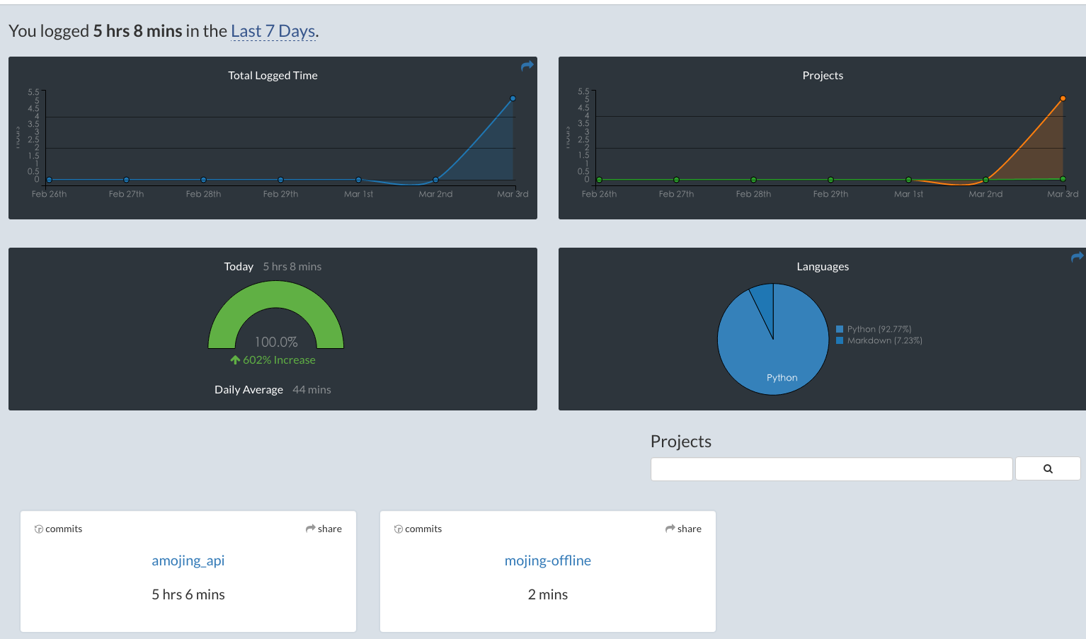 用来量化工作量,我用的PyCharm,只要安装官方提供的插件后,就能统计我当天为每个项目敲代码的时间,而且能统计我都谢了那些代码,比如JS占10%,Python占90%
