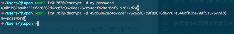 此时,我们配置中心的加密解密功能就已经可以使用了,可以访问 /encrypt 和 /decrypt 来使用加密和解密功能。这两个端点都是 POST 请求,我们来用 curl 测试下: