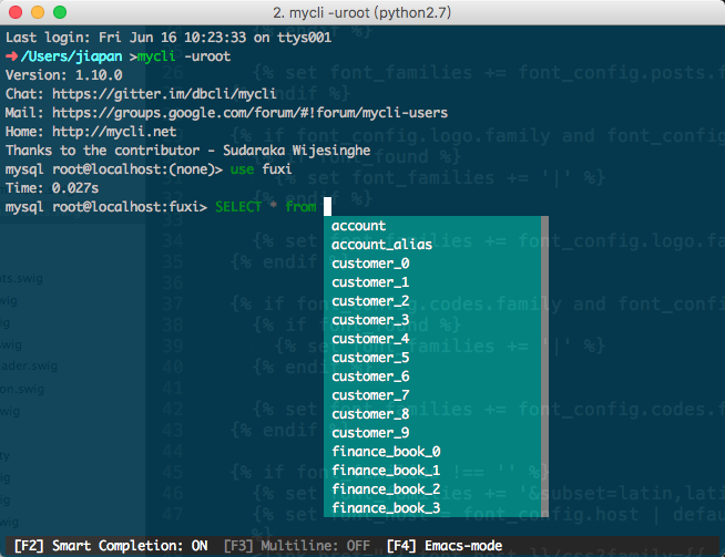mycli 是一个支持语法高亮和命令补全 mysql 客户端,类似于 ipython。安装过程比较长,主要是中间安装 Pyhton 2.7.13 占用了很长时间。装完后直接 mycli -uroot 就进入数据库的交互状态了。有一个地方不太习惯,没执行一个命令出来结果后,需要再按一下 q 才能返回交互状态。