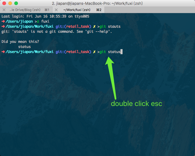 thefuck 装完后在 .zshrc 的 plugin 中配上了插件,这样的话用起来就更方便了,当输错命令或者需要 root 权限却没加 sudo 时,只需要双击 esc 就可以了。