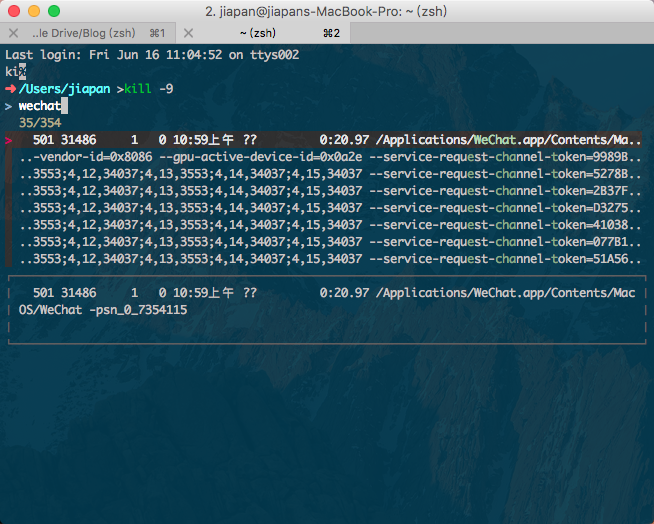 fzf 是命令行下模糊搜索工具。通过 brew install fzf 安装完后,还需要执行 /usr/local/opt/fzf/install 安装 shell 扩展,之后 Control+r 时出来的就不是之前那种很简单的历史命令搜索结果了,而是交互性很棒的结果。输入 kill -9 + <TAB> 能通过模糊搜索的方式搜到需要杀掉的进程,再也不用先 ps -ef | grep xxx 找到对应的进程然后在执行 kill 或者 通过管道 + xargs 的方式来杀进程了。