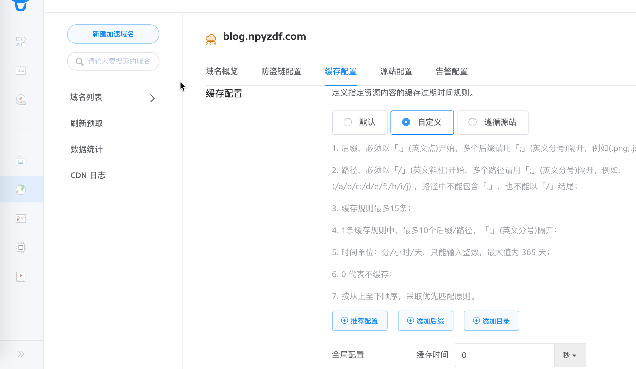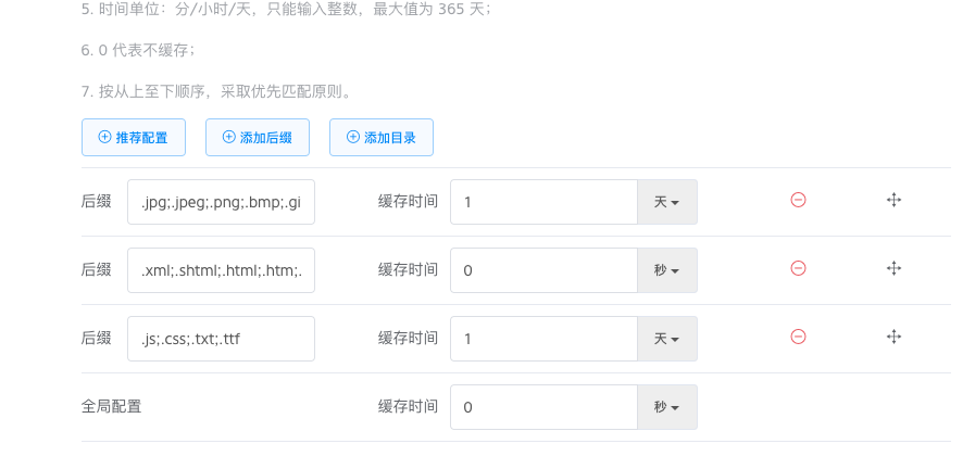 图片和样式文件进行缓存,html 等文本文件不缓存。因为七牛会自动寻找 index.html,所以在真正访问时,不带 /index.html 后缀的页面也可以打开,所以我把全局配置设为了不缓存,也就是说不在这个配置中的文件也不进行缓存。