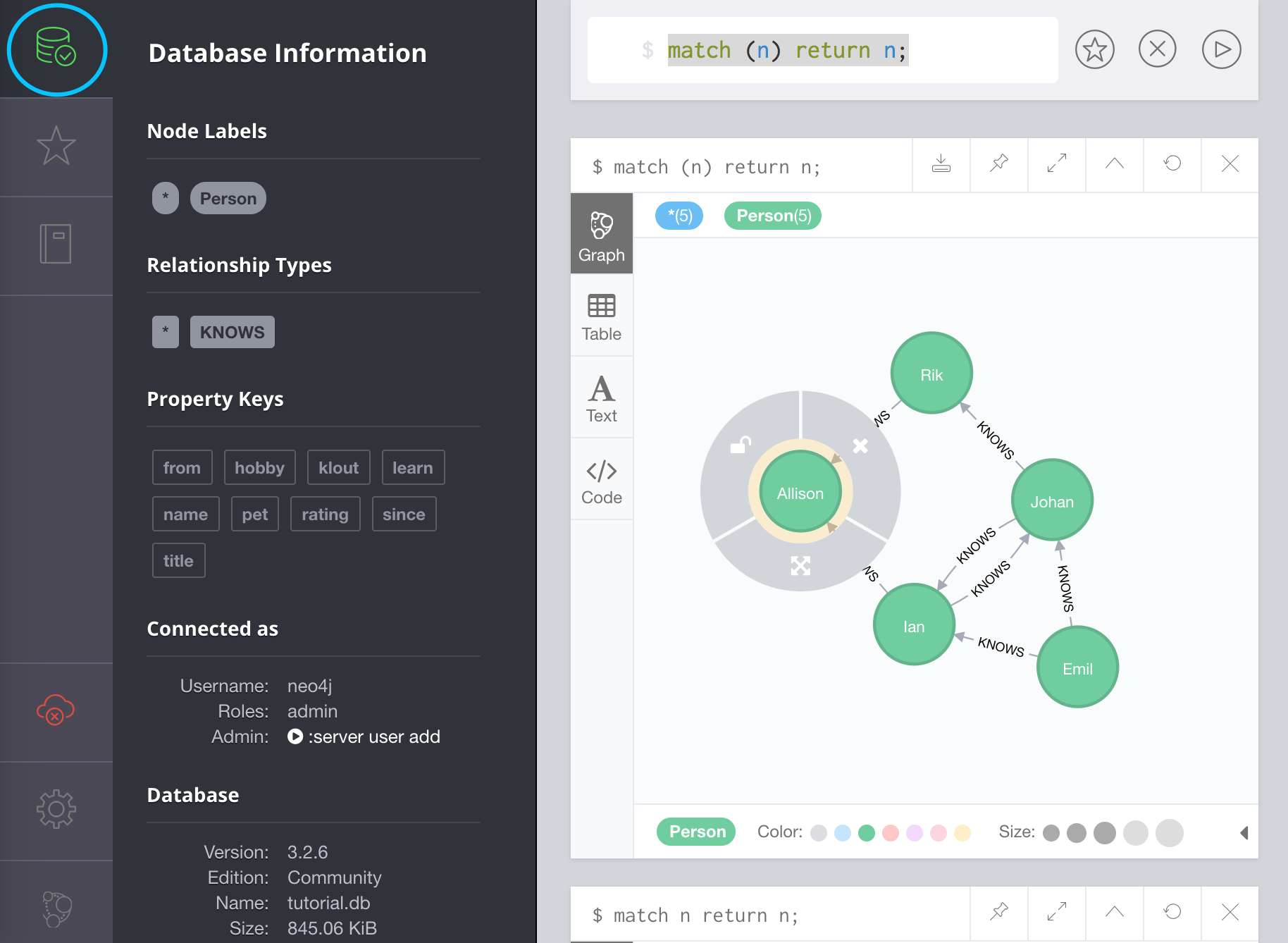 Neo4j 浏览器可以用来添加数据、运行查询语句、创建关系等等。它还提供了一种简单的方式来可视化数据库中的数据。