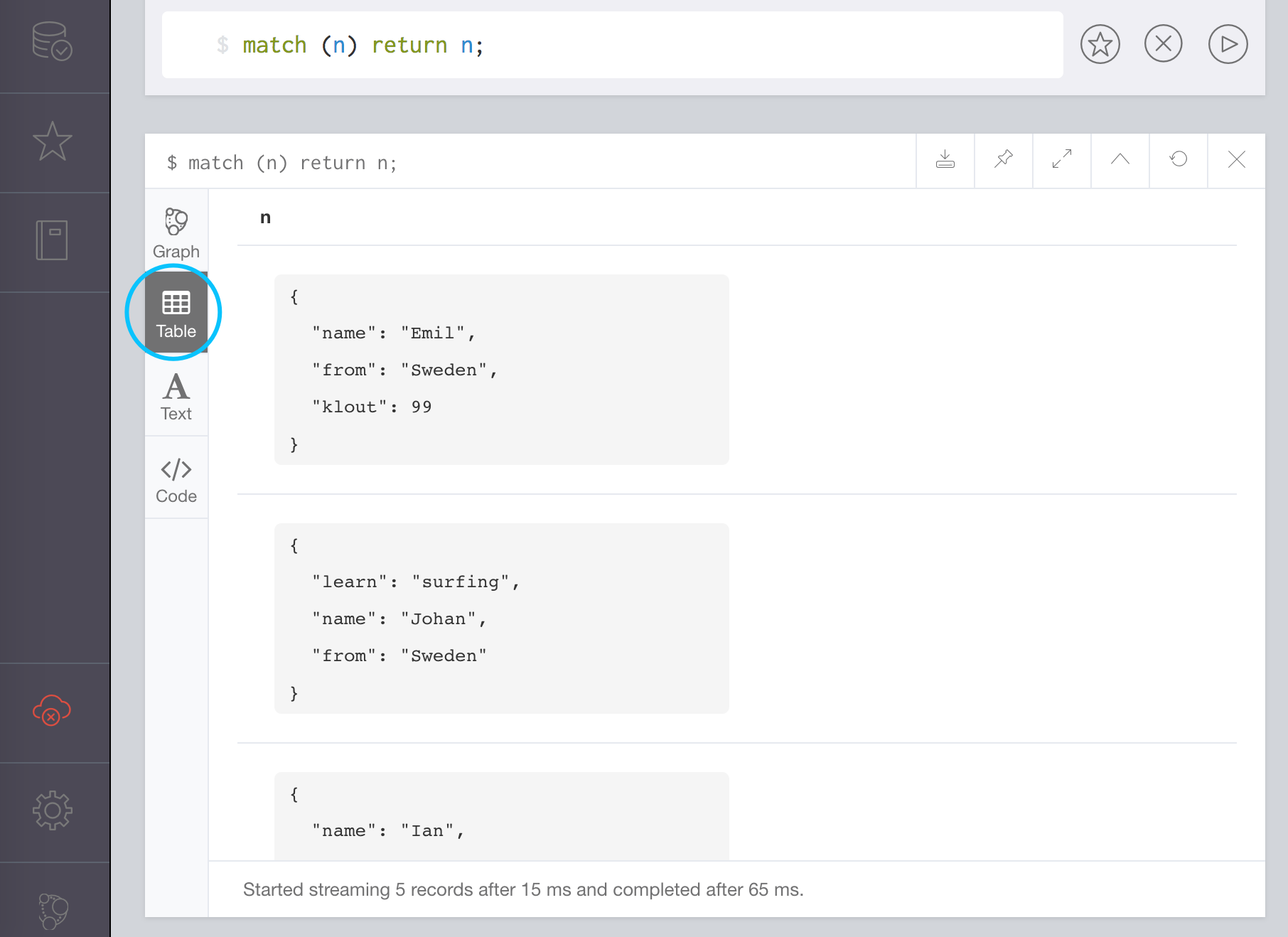 你能够以不同的方式查看数据。例如,点击 「Table」将会以表格的方式显示节点和关系。