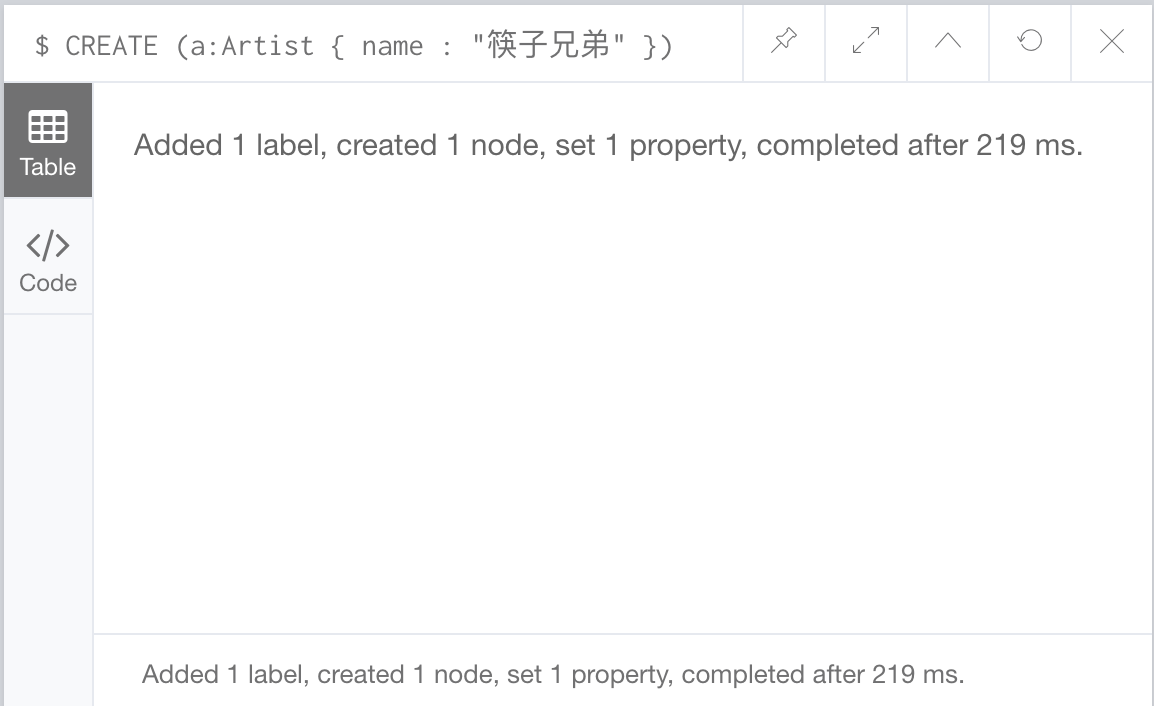 这个 Cypher 语句创建一个带有 Artist 标签的节点,节点有一个 name 属性,该属性的值是筷子兄弟。