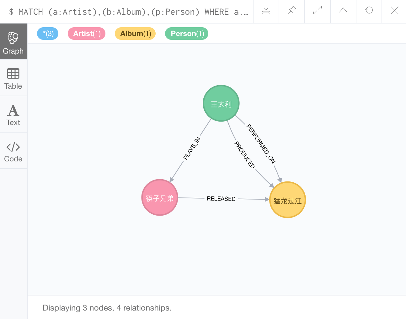 我们给这个关系一个变量名 r 并且给了一个 RELEASE 类型(乐队发行专辑)。关系类型和节点的标签概念类似。