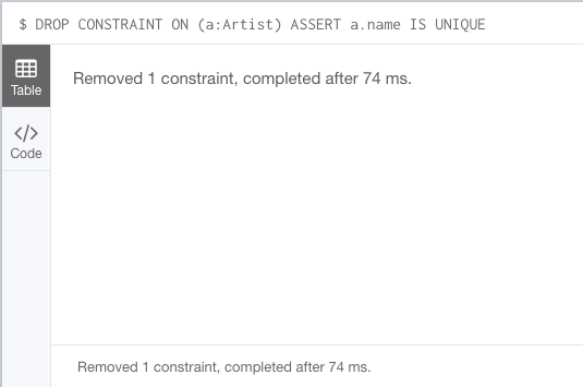 1 | DROP CONSTRAINT ON (a:Artist) ASSERT a.name IS UNIQUE |