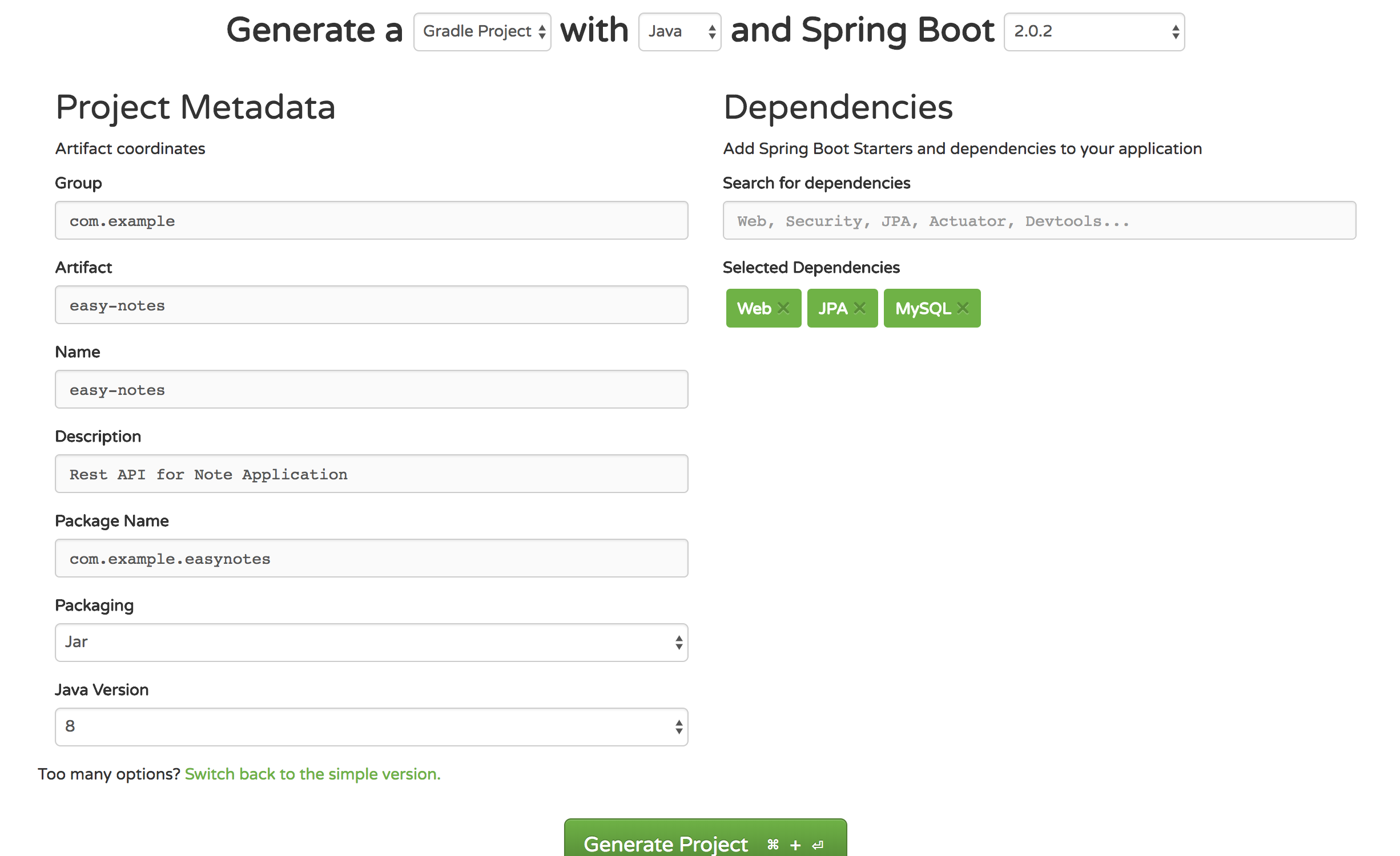 Spring Boot 提供一个 web 工具叫做 Spring Initializer 来引导一个应用。访问 http://start.spring.io 然后按照下边的步骤来生成一个新的项目: