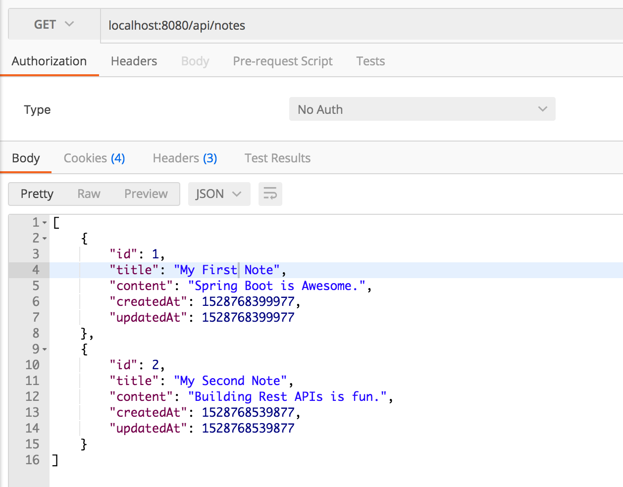 上边的方法非常简单,它调用 JapRepository 的 findAll() 方法来检索数据库中所有的笔记并返回整个列表。