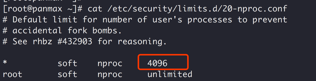 普通账号下 ulimit -u 得到的值默认是 /etc/security/limits.d/20-nproc.conf文件中指定的: