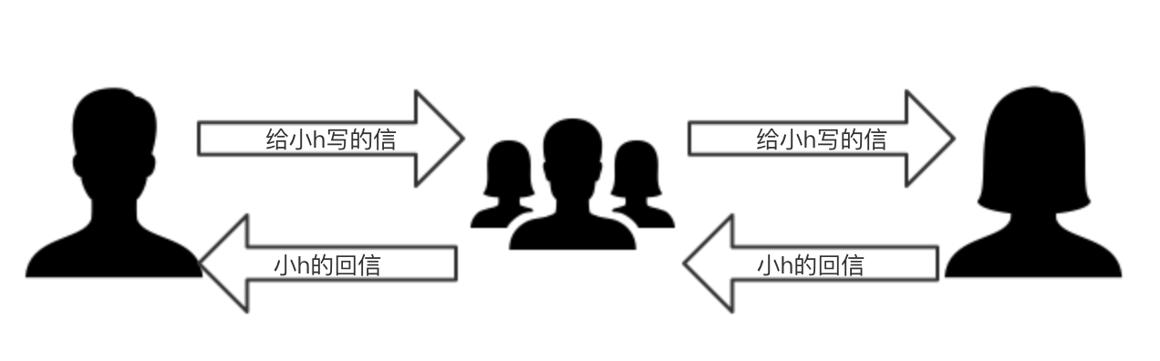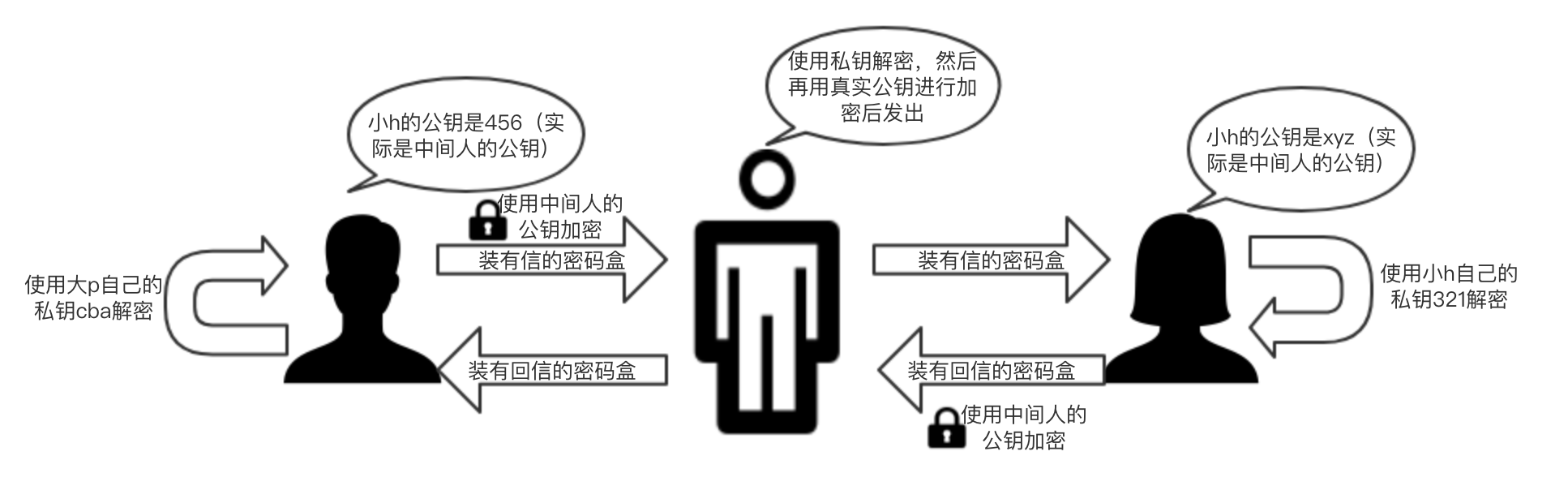 当大p写完信后用他认为是小h的公钥加密时,实际用的是小x的公钥,小x只需拿到加密的信后用自己的私钥解开看一看,可能再改改信的内容,然后再用小h的公钥把信加密后交给小h,反过来同理。