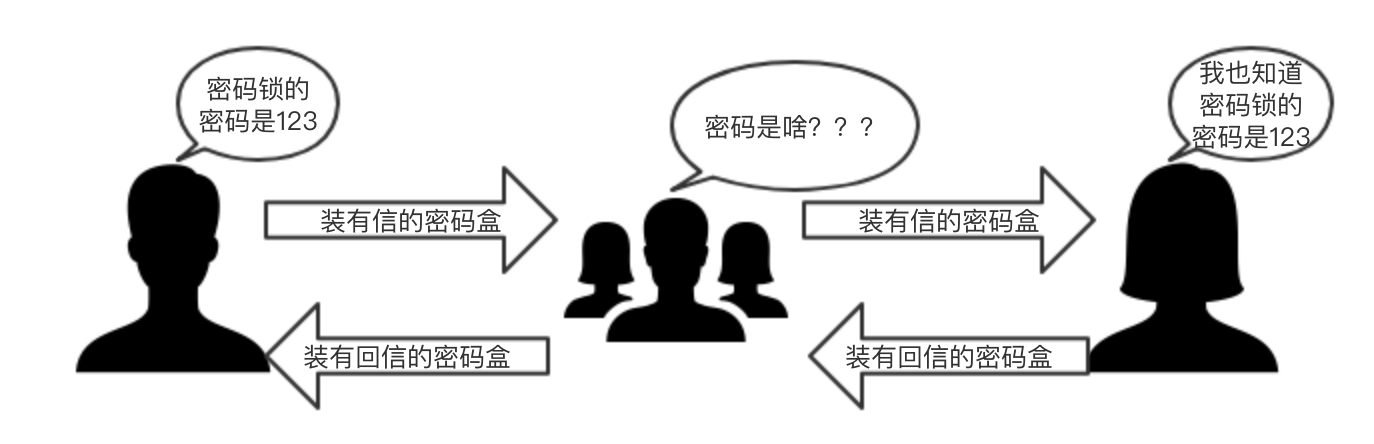 大p想到了一个对策,把信放在一个带有密码锁的盒子里,这样就由之前的直接传递小纸条改为了传递有密码锁的盒子。示意图如下: