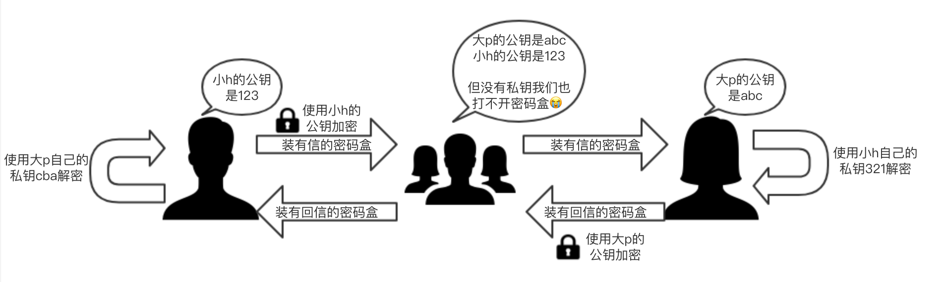 也就是说此时他们两个每人有一个属于自己的私钥。这样只需要每次写完信后,用对方的的公钥把盒子锁上,对方拿到后用自己的私钥解开盒子取出信件,写完回信后再用另一方的公钥锁上盒子即可。