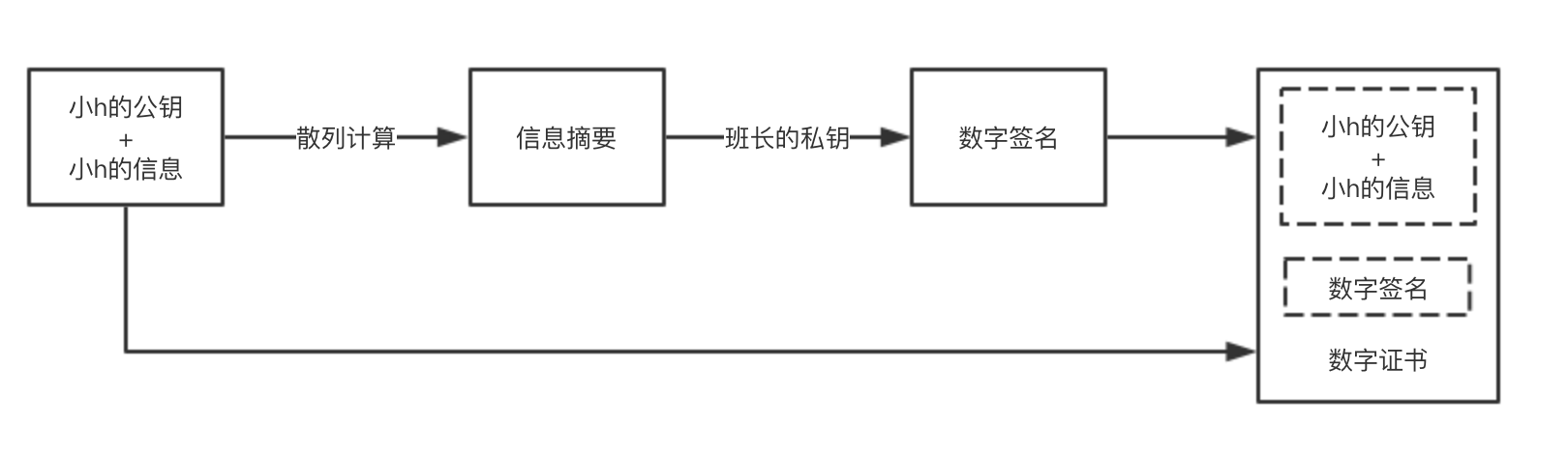 小h为了让大p(也包括其他追求者)拿到不被篡改的公钥,需要把自己的公钥交给班长,她虽然和班长没有进行面交,但班长经过一系列严格而且复杂的检查确认了这个公钥确确实实是小h的,然后班长会把小h的基本信息(比如姓名、学号)和小h的公钥放在一起,然后对以上内容做一次散列计算后得到一个信息摘要(也叫指纹),这个指纹可以保证只要班长拿到的小h的基本信息或小h的公钥有任何修改,再次散列计算后得到的指纹一定不同。