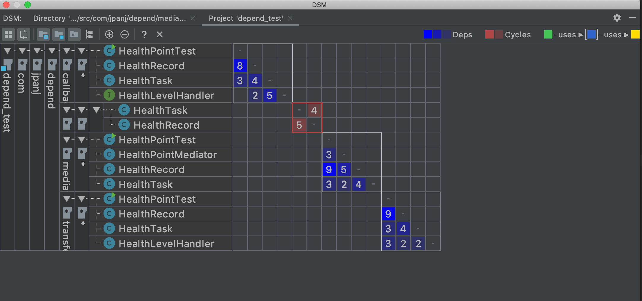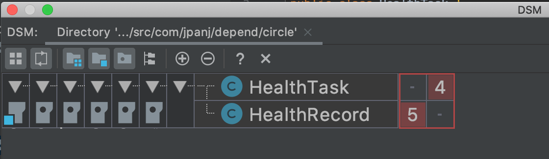 我们可以使用 IDEA 自带的 Analyze Dependency Matrix 对包含 HealthRecordHealthTask 类的包进行分析,得出系统中存在循环依赖代码的提示。