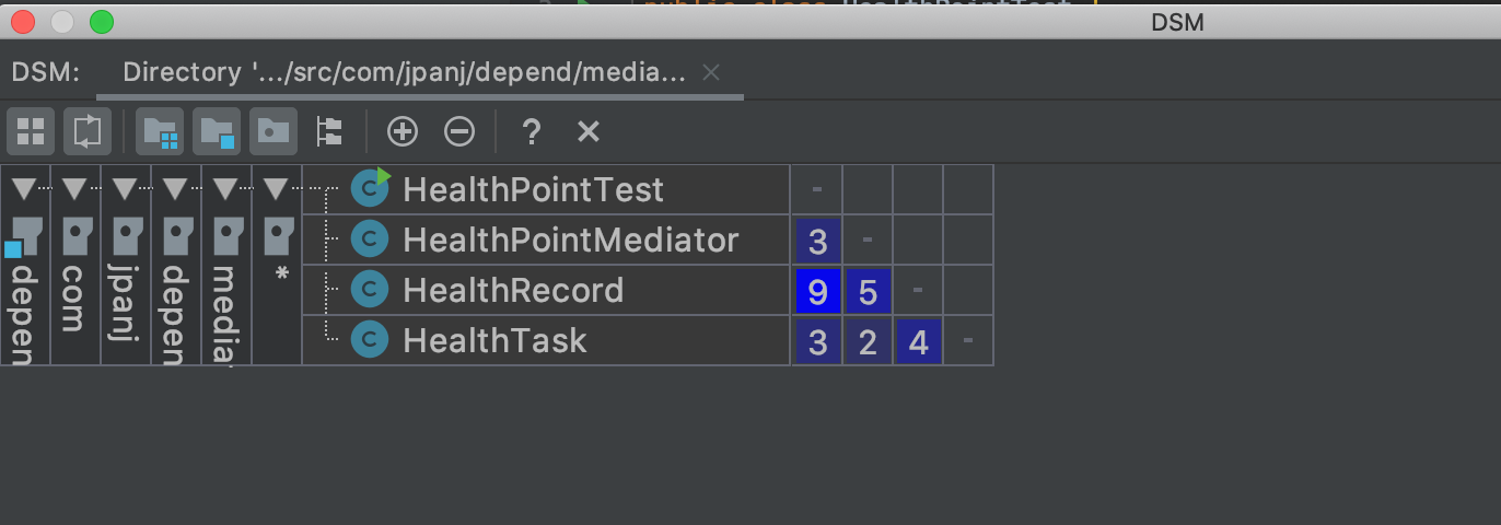 HealthRecord 中我们创建了 5 个 HealthTask,并赋予了不同的初始积分。然后通过 HealthPointMediator 这个中间者分别对每个 Task 进行积分计算。最后我们再次使用 Analyze Dependency Matrix 分析下当前的代码是否有循环依赖。