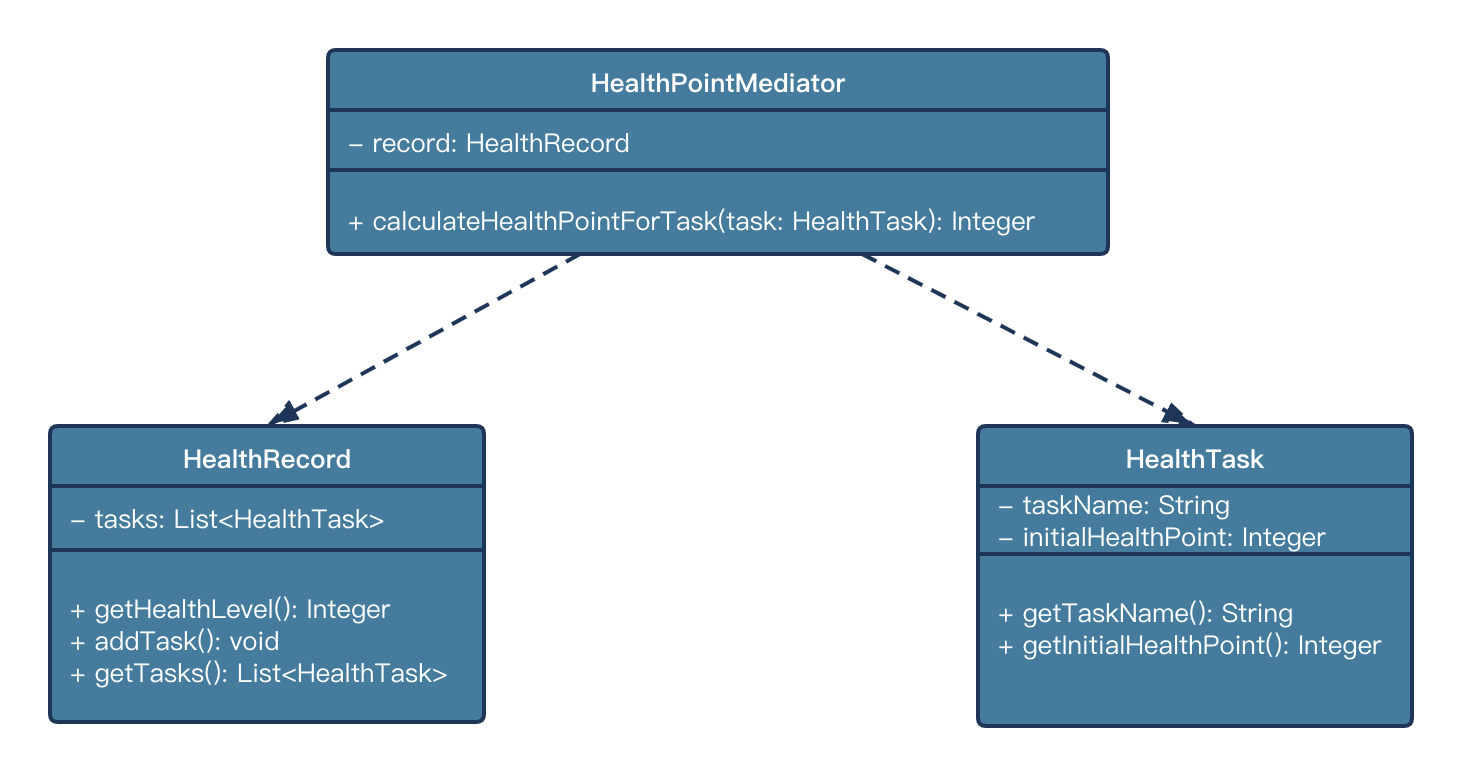 这个中介者组件的实现也不难,可以通过提供一个计算积分的方法对循环依赖进行剥离,这个方法同时依赖 HealthRecordHealthTask 对象,并实现了原有 HealthTask 中根据 HealthRecord 的健康等级信息计算积分的业务逻辑。