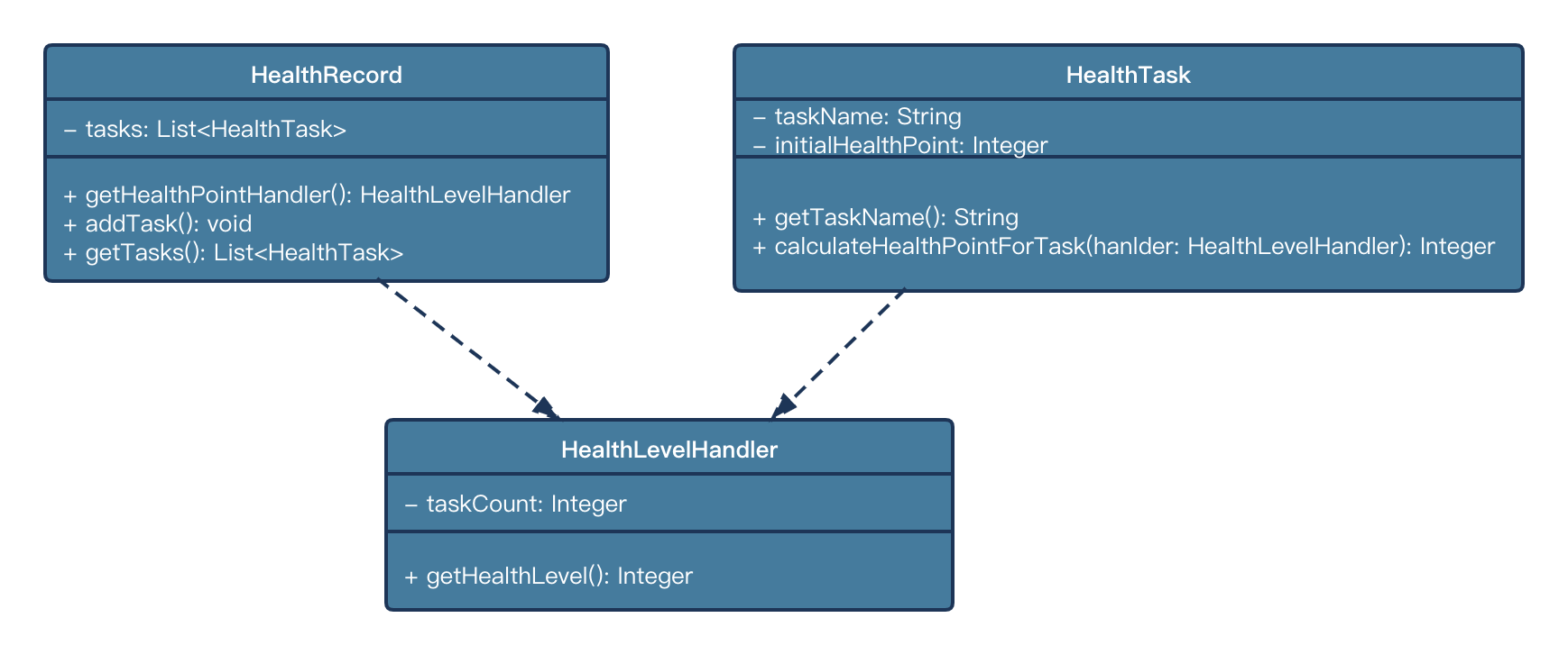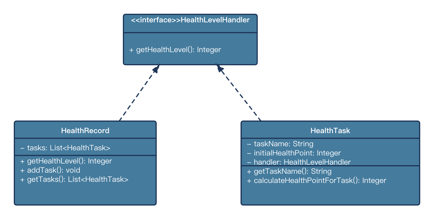 对应的 HealthTask 中,显然应该包含对 HealthRecord 的引用,同时也实现了计算任务积分的方法 calculateHealthPointForTask()calculateHealthPointForTask() 方法中用到了 HealthRecord 中的健康等级信息 getHealthLevel()