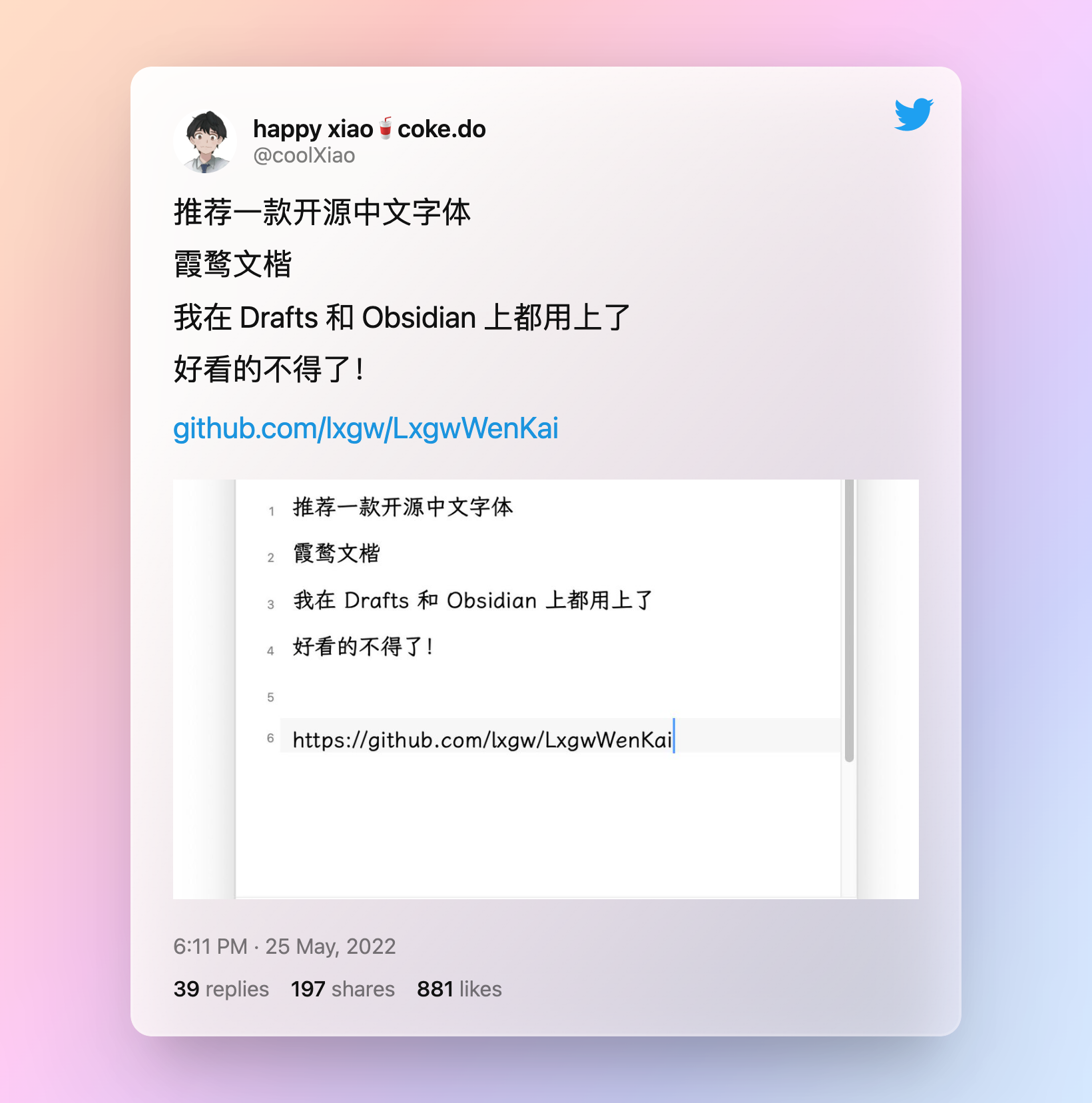 之前访问过我博客的人可能会发现我博客的字体变了,这款字体是我前段时间在 Twitter 上看到一个很喜欢的博主推荐的,是一款开源字体,名字叫「霞鹜文楷」,非常适合作中文展示,阅读起来使人感受愉悦。