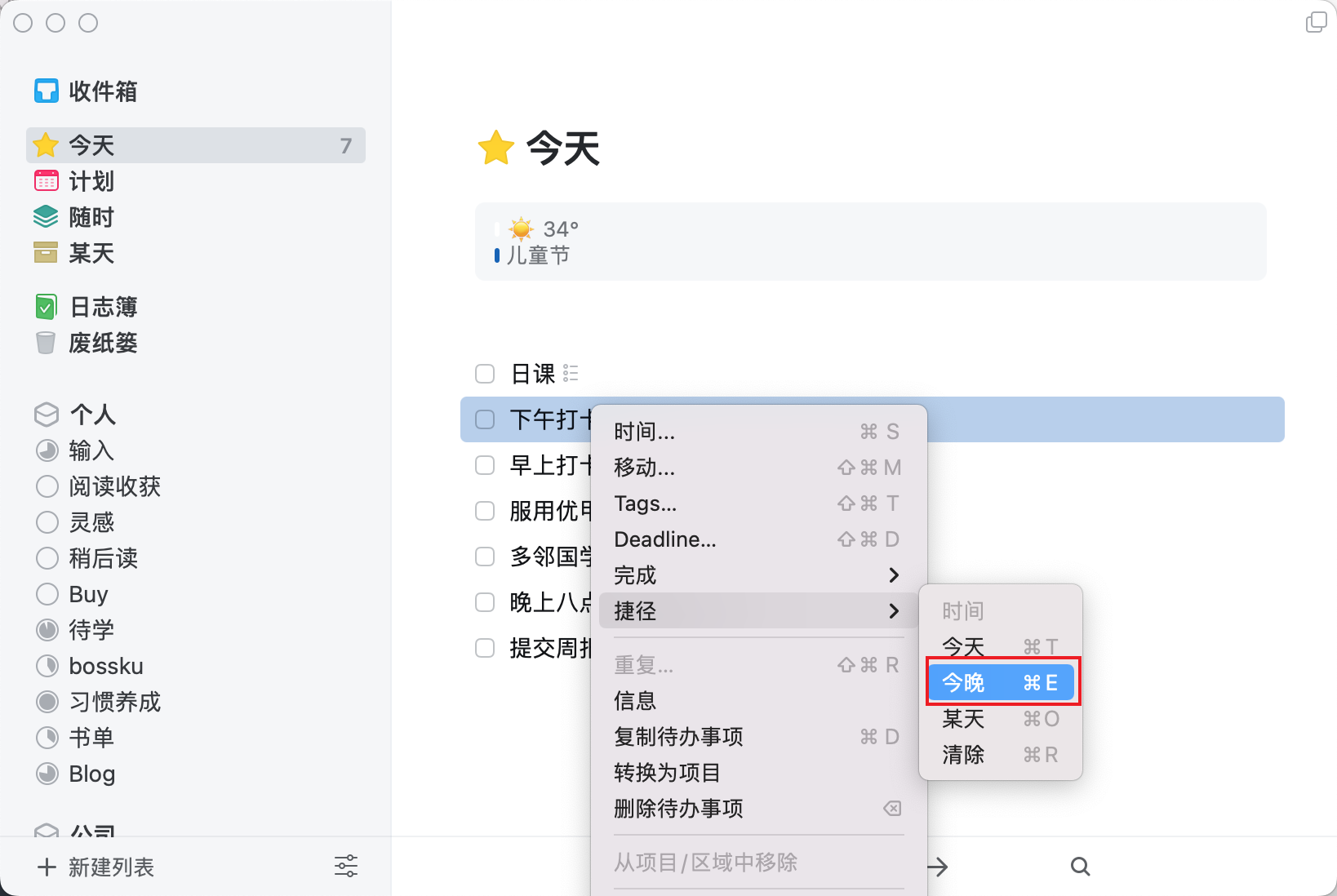 Things 提供了一个退而求其次的方案,将晚上做的事情通过分割线放到下方,在事项上点击右键就可以操作或者使用快捷键 Command + E。