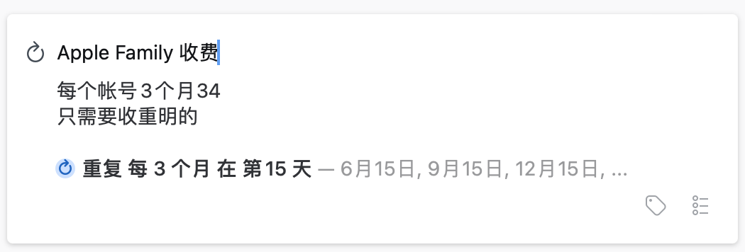 下边图中的「Apple Family 收费」和「提公积金」也是我的循环事件,循环时间不进支持每日,还支持每几日、每周几、每月几号等等。