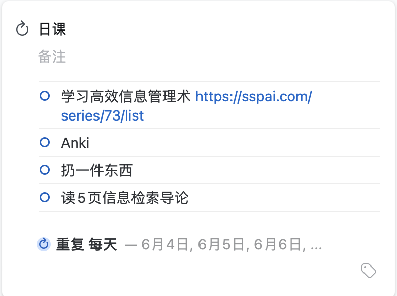 上边图中国年还可以看到,我有一个叫「日课」的循环项,后边有三条圆点线,表示这个事项中包含有子事项,也就是我给自己约定的每天要做的事情: