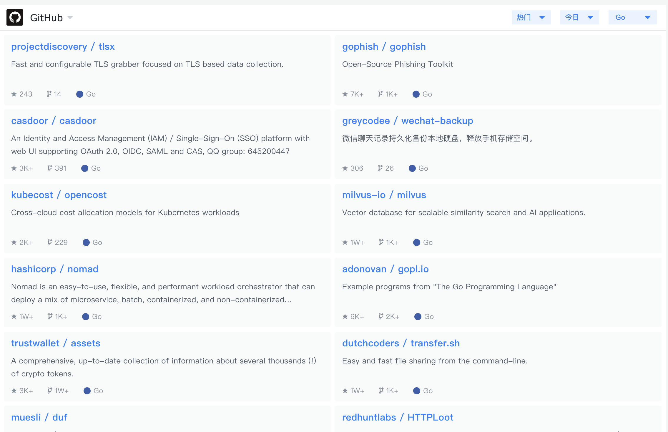 我用掘金提供的插件作为浏览器新标签页的默认首页,这个页面中间一栏有 GitHub 上的项目列表,我会不定期看一些我关注语言(如 Go、Rust、Python)又出了哪些新玩具,按热门排序,如果想看新鲜有趣的就看今日,如果想看长盛不衰的就看本周或者本月。