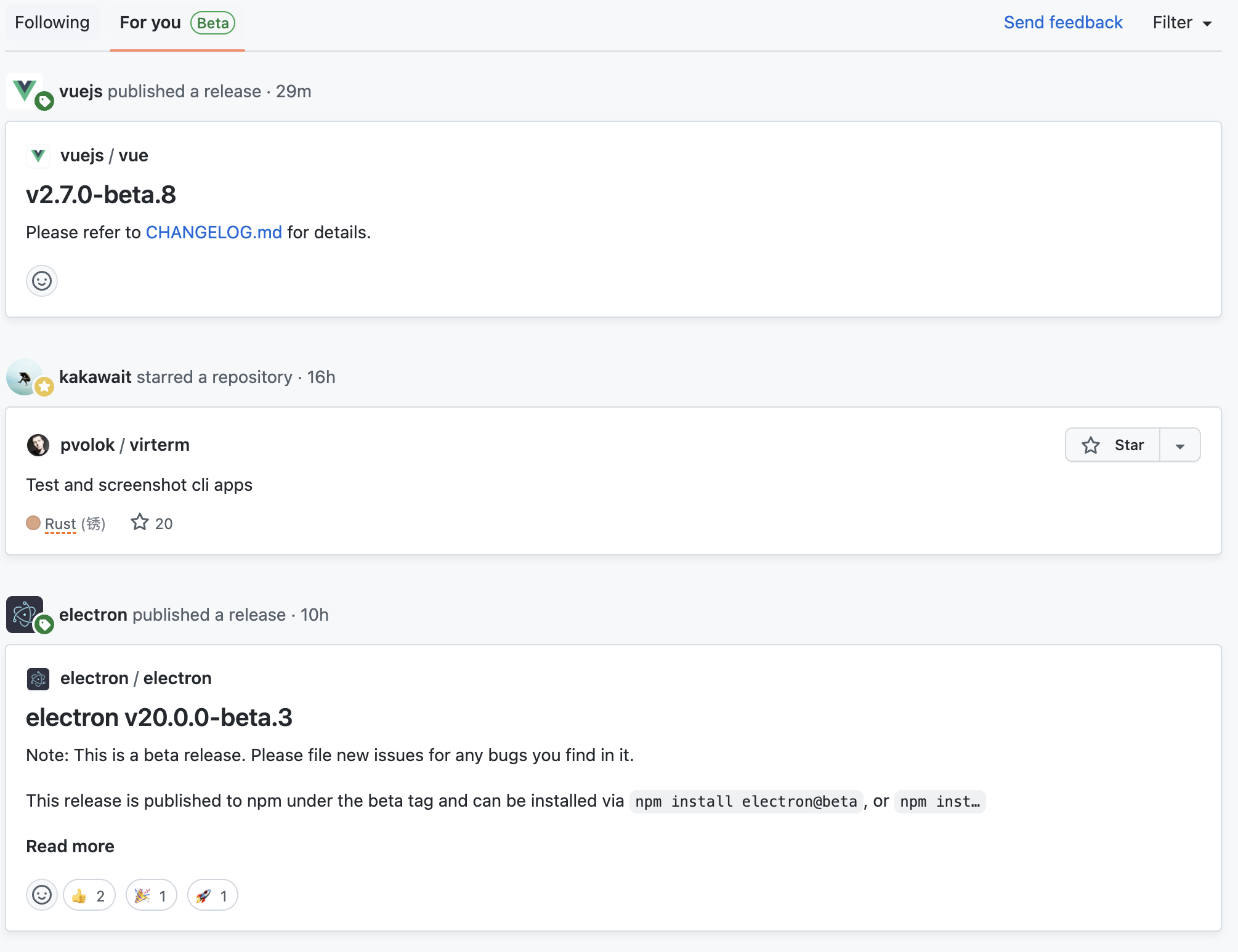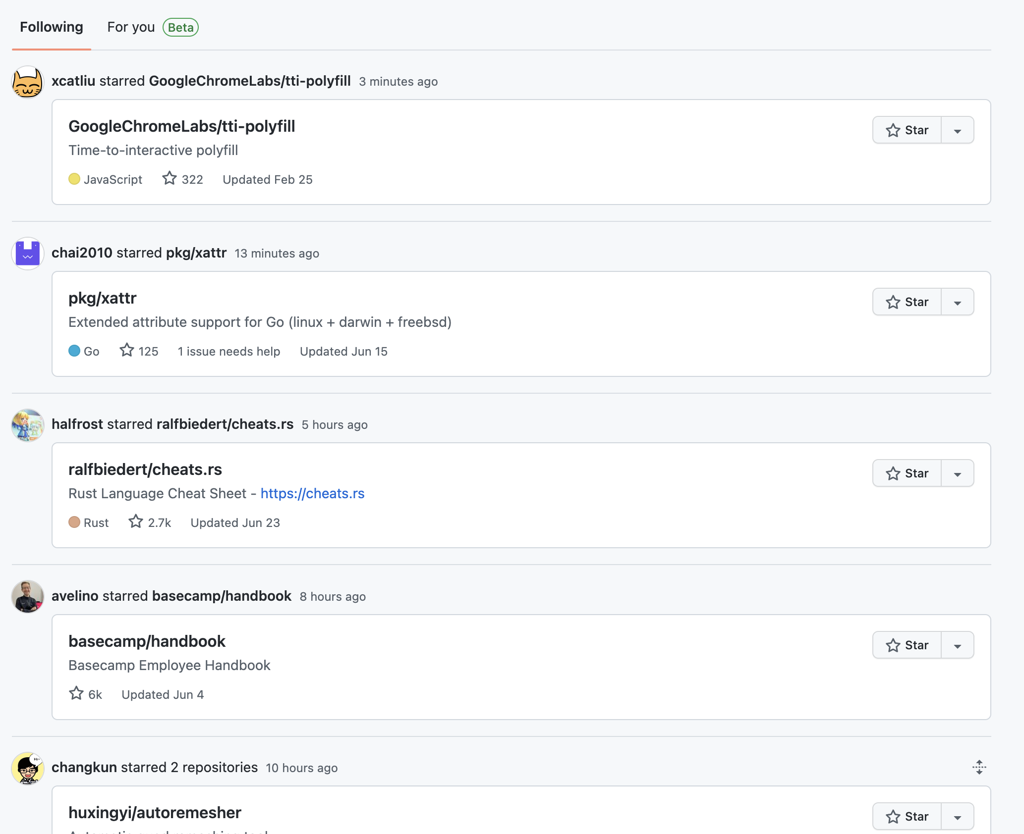 上边提到的掘金的 GitHub 项目列表,是按照 Star 增量和项目创建时间计算得出的,所有人看到的都是相同的静态数据,GitHub 官方也有自己的两个 Feed 流,分别叫 Following 和 For you。