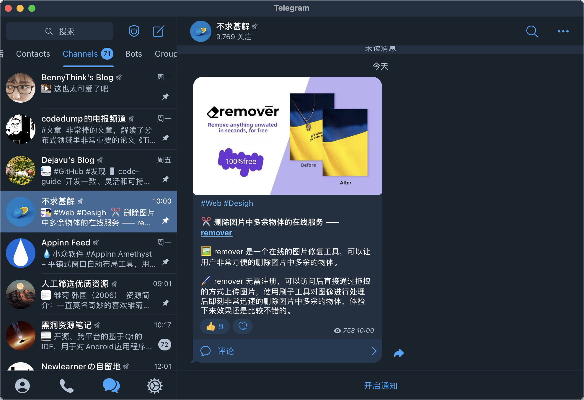 Telegram channel 是个小宝藏,类似于一个除了群主其他人禁止发言的群,群主产生优质内容后随时发到群里,列几个我自己常看的 channel: