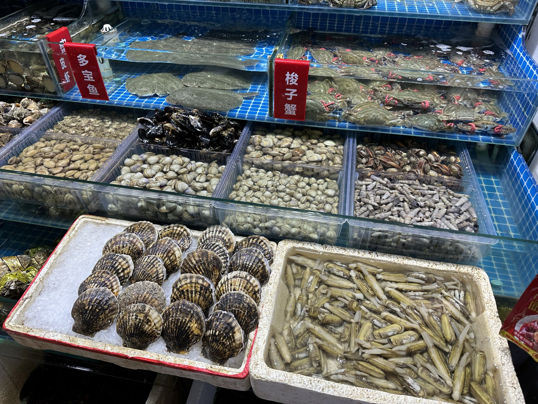这个菜市场太棒了,但因为我的主要目的是逛,并不是买买买,新家这边装备也不齐全,即便买也只能买些好处理的,最后我买了一斤多蛏子、一斤多白蛤准备到家后白灼,又花1块钱买了根葱和一小块姜。