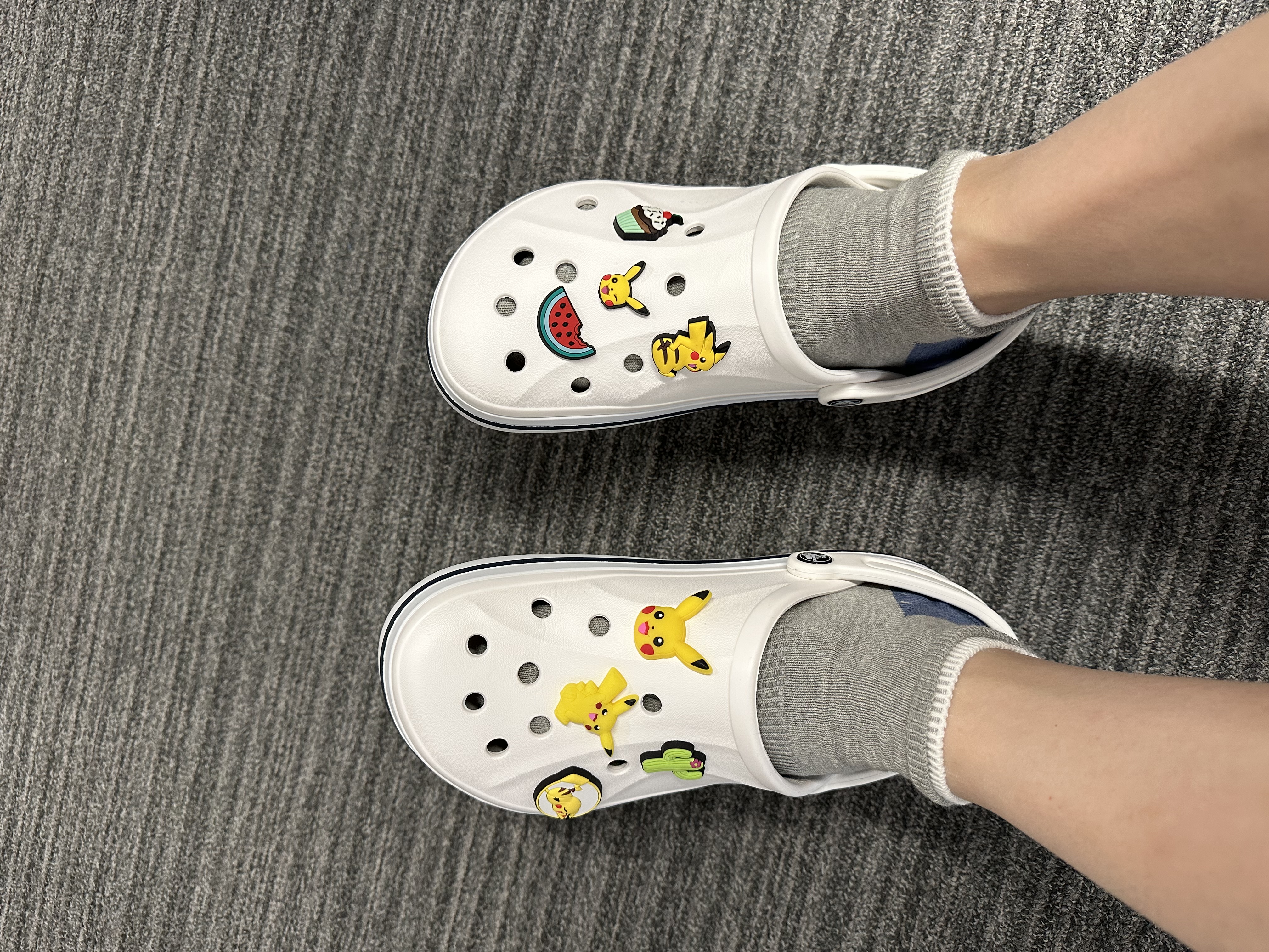 这双鞋穿起来确实非常舒适,但是最吸引我的并不是它的舒适性和外观,而是这鞋居然可以搞 DIY,鞋子上的洞洞是一个个插槽,可以自由组装自己喜欢的饰品,这真的是又让我眼前一亮。