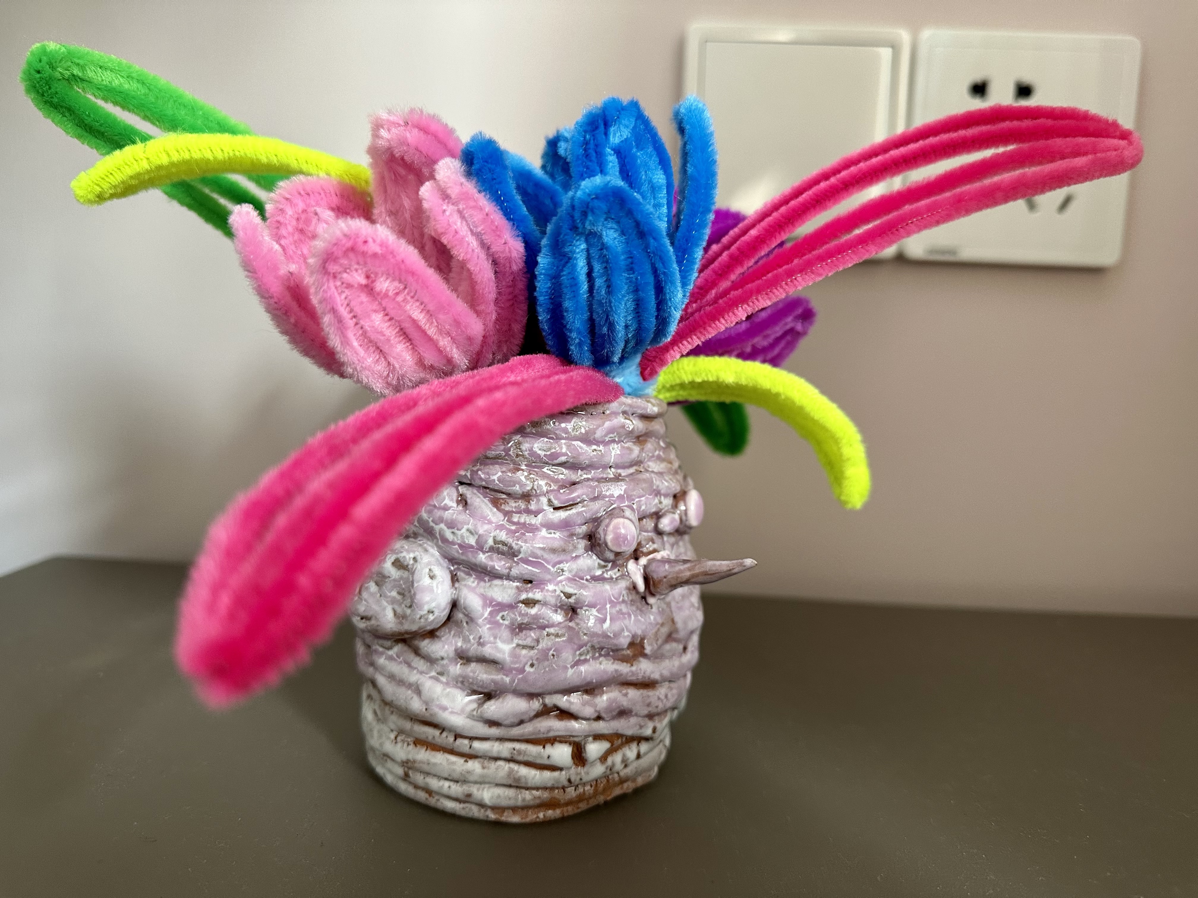 小念今天带回了她的第一件陶艺作品,一只啄木马笔筒,里边插了扭扭棒做的花: