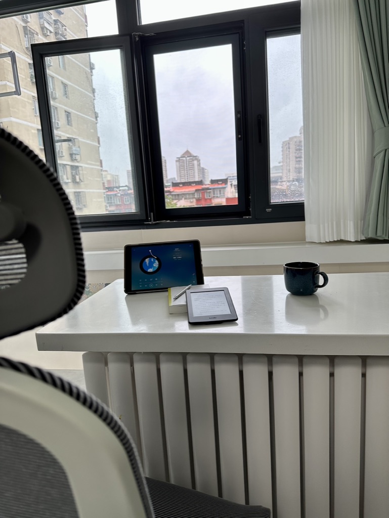 周一早上把电脑搬了过来,把吧台作为了一个可以观景的办公环境。