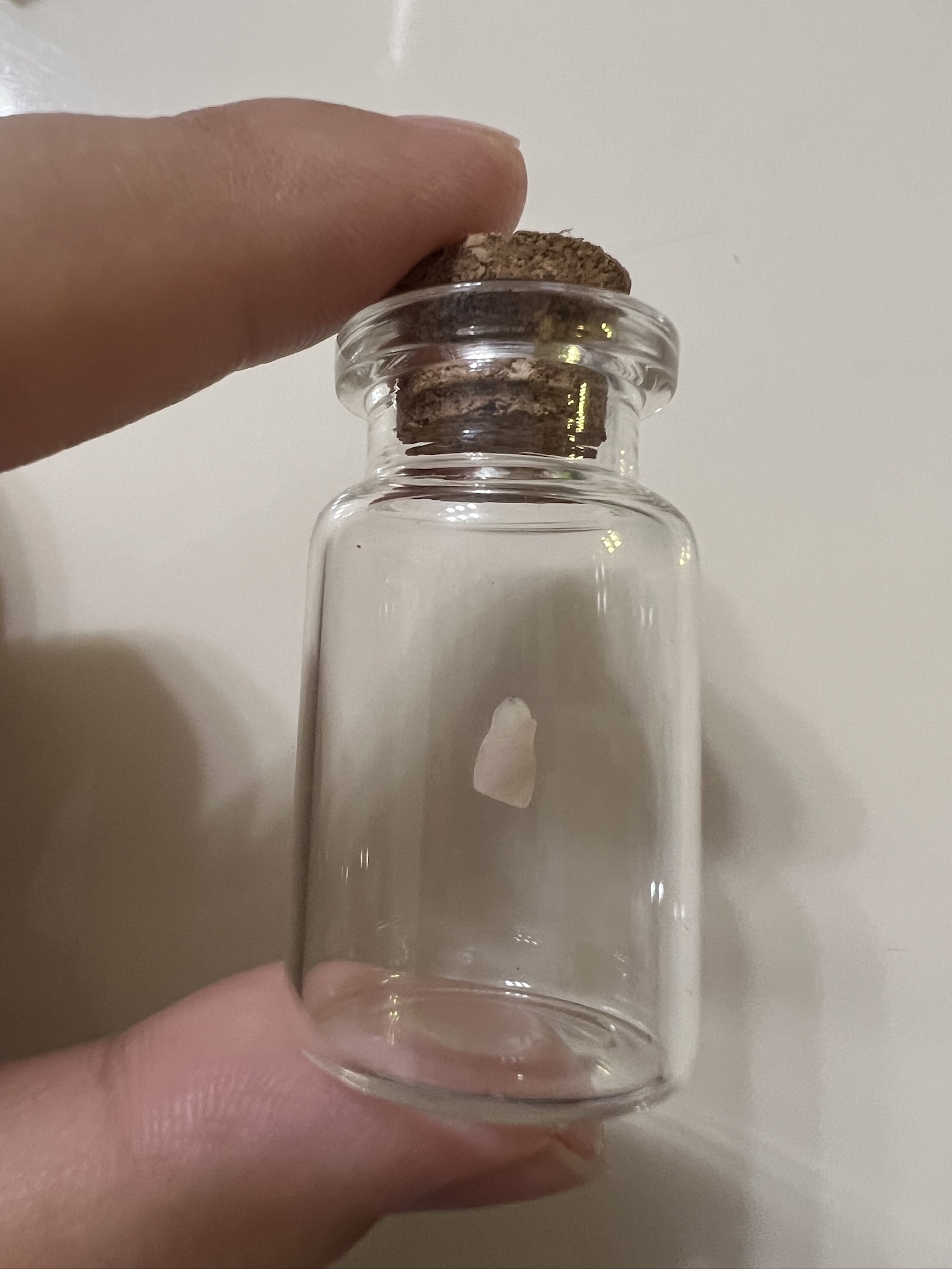 我错过了念念最好玩的一段时间,前段时间她掉了第一颗乳牙,她把这颗乳牙放进一个小瓶子里,然后跟我发微信视频炫耀,我看到她的喜悦,可心里却酸酸的。