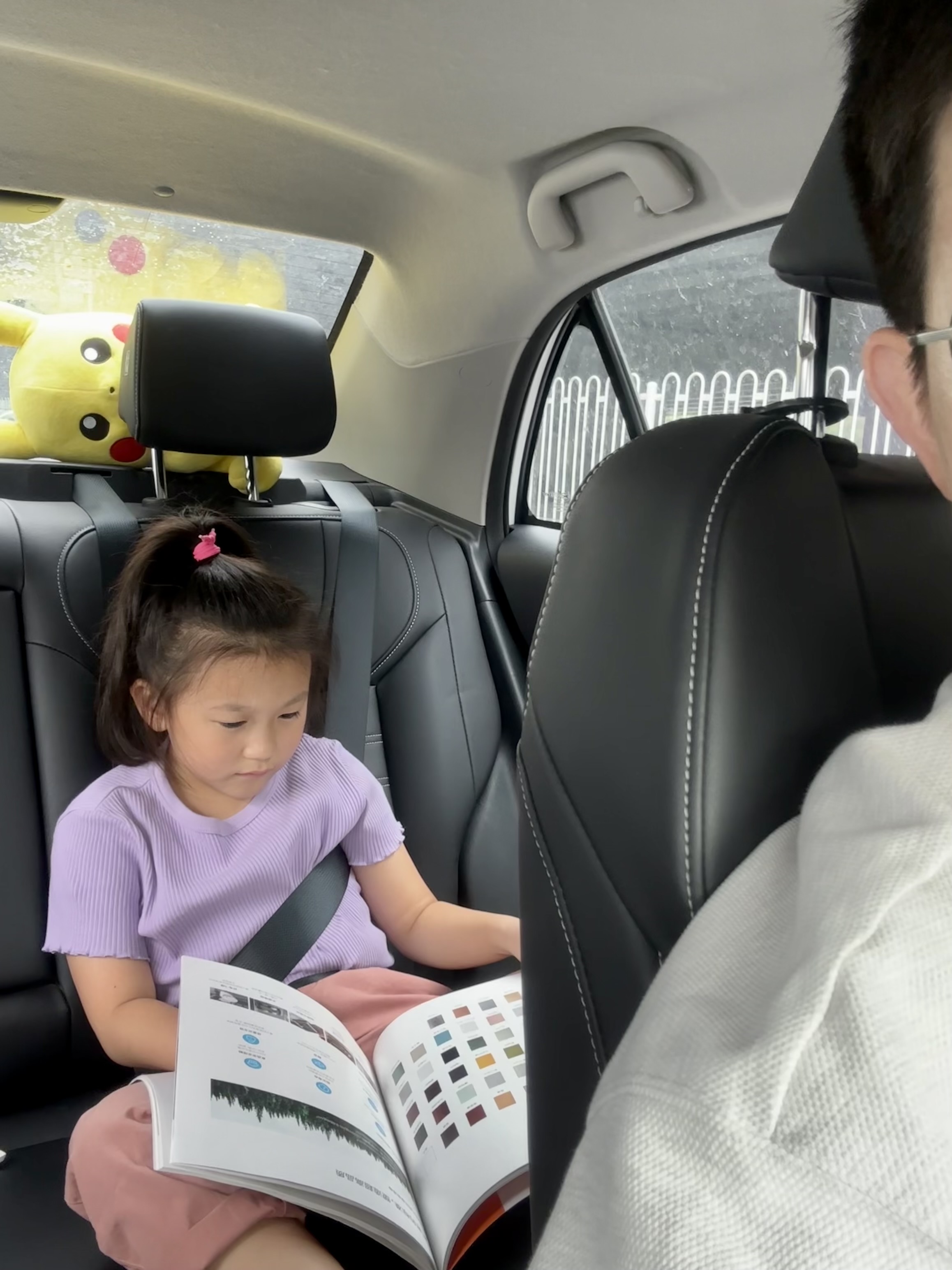 我让念念坐在后排,给她记上安全带,后排有一本装修公司之前给我们选装修风格和材料的书,她因为无聊就翻那本书看,时不时问我一些关于装修的问题,出奇的乖。