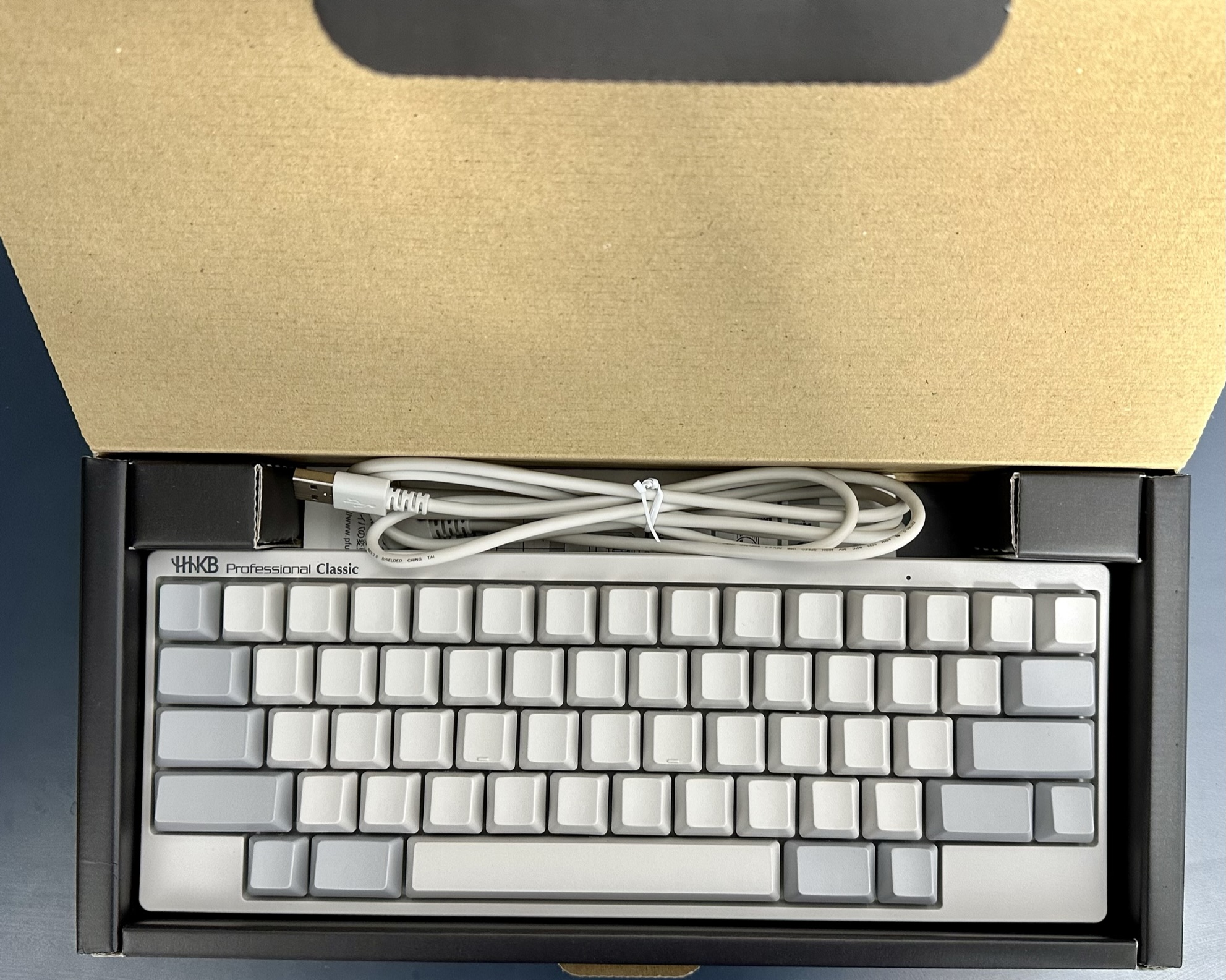 到家后迫不及待打开盒子开始欣赏这个键盘,真新啊,非常喜欢 HHKB 这种设计的简洁感,HHKB 全名 Happy Hacking Keyboard,果然是程序员的开心键盘。