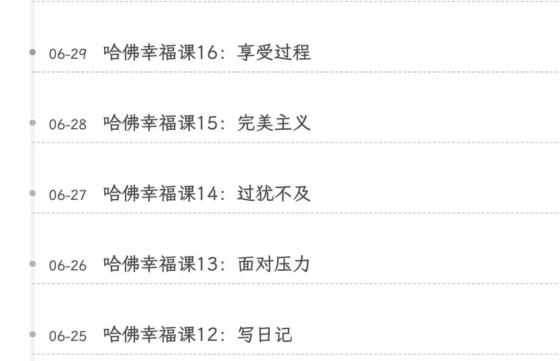 今天终于把哈佛幸福课的23集都看完了,每集一个半小时,一开始一天看一集,真的有点长,时间很紧张,而且每看完一集我都会通过 AI 提取出文章中的关键点,把这些内容读一遍改一改病句还要再花一些时间,每天花在学习幸福课上的时间超过2小时,导致我一整天的时间安排都很紧凑,学习这门课的初衷是让自己更幸福,现在反而更不幸福了,这段时间也通过这种方式水了好几篇文章。