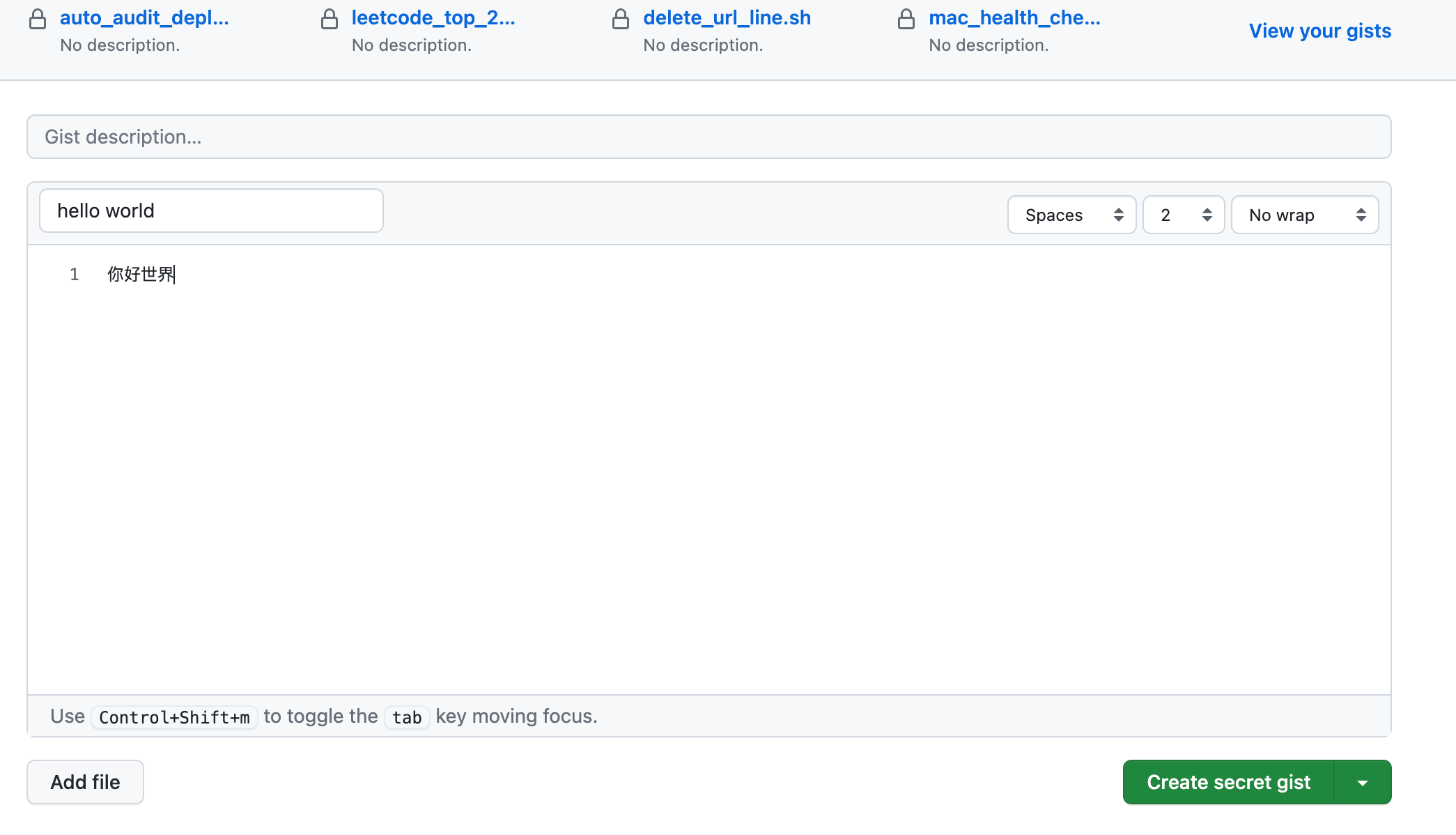 https://gist.github.com/ 是 Github 的一个子服务,通常用于托管或分享一些代码片段。与 git 不同的是,无需创建仓库,一个文件就是一个 gist。在打开 gist 首页后,可以直接填写文件描述和文件内容。