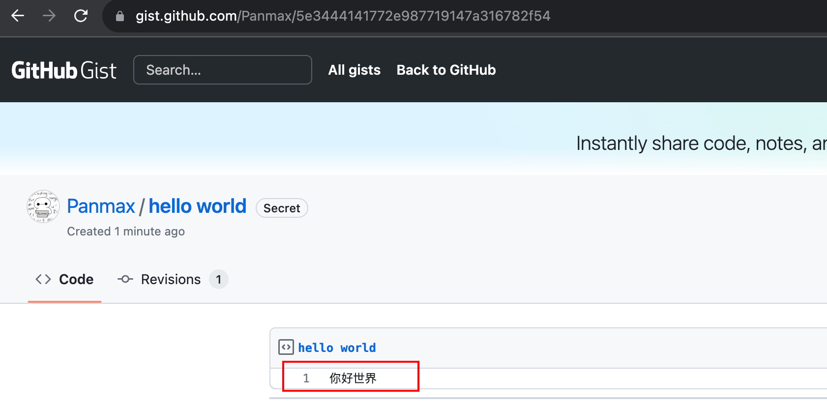 例如,我刚刚创建的 gist 链接是:https://gist.github.com/Panmax/5e3444141772e987719147a316782f54